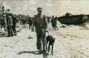 The Dobermans of the 2nd and 3rd Marine War Dog Platoons saw action in some of the fiercest battles of the Pacific campaign - Guam, Bougainville, Peleliu, and Iwo Jima among them. These dogs endured gunfire, heat, shrapnel, and disease alongside their handlers, showing an unwavering drive to complete their mission. In some operations, they were the first to make landfall, leading troops into jungle combat or through mined beaches. One of the most famous dogs was "Kurt", who served in Guam in 1944. Kurt detected enemy movement and alerted his unit just before a Japanese ambush, saving more than 250 Marines. He was mortally wounded in action and became the first dog buried in what is now the "National War Dog Cemetery" on Guam.